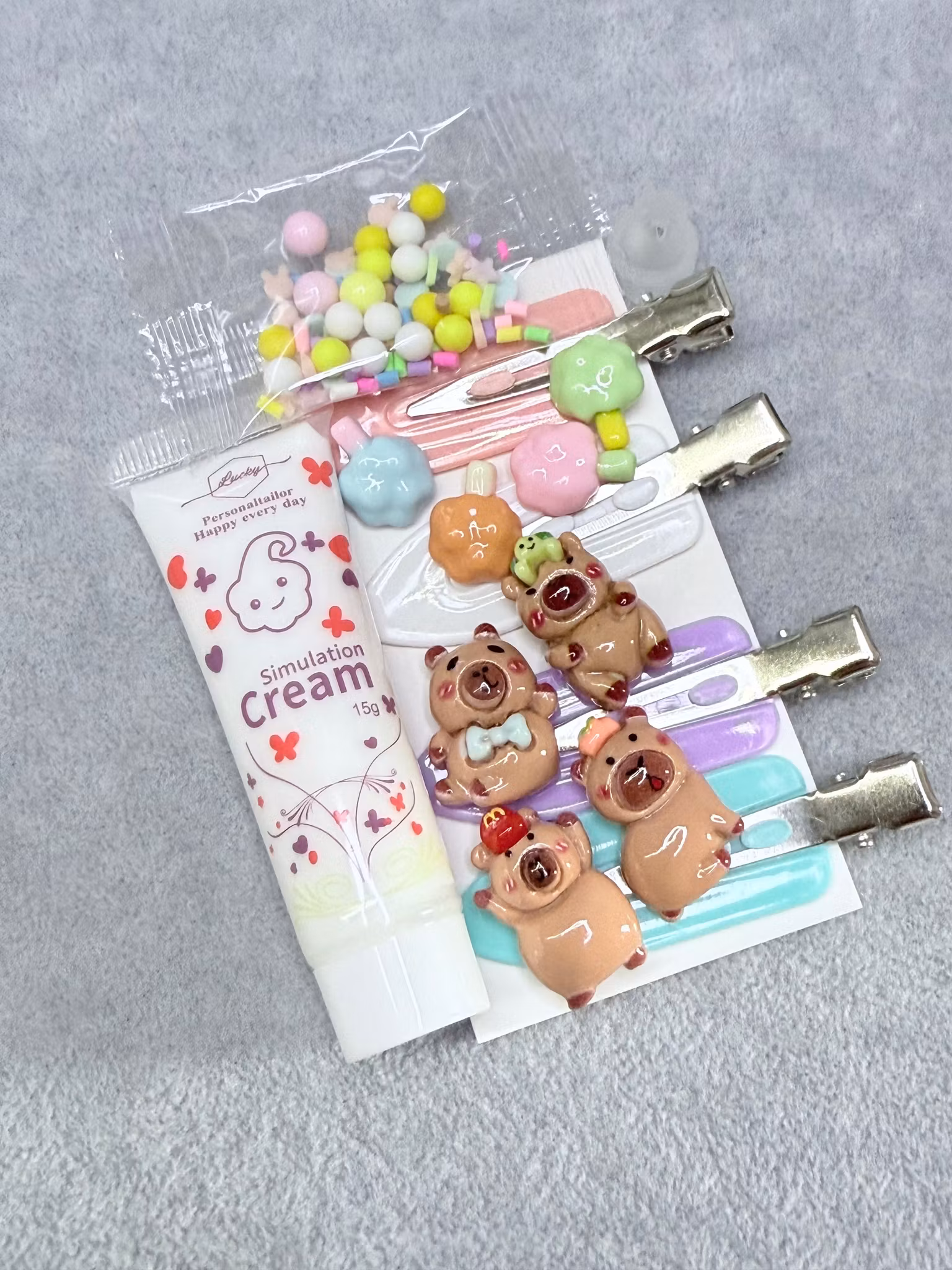 Innehåller: 4 hårspännen, flatsbacks, strössel och Vitt Flufflim 15g